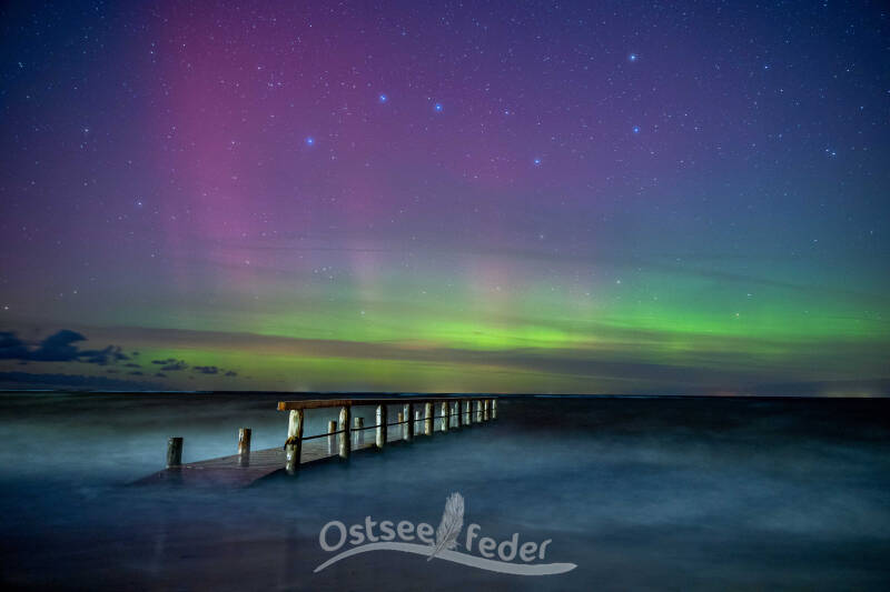 Mary und ich wanderten mit unseren Stativen und Kameras am Strand vor dem Steg hin und her. Immer in die Richtung, in der die Licher tanzten. Und während wir stoisch hinter unseren Kameras standen, lief Finn munter zwischen uns hin und her.